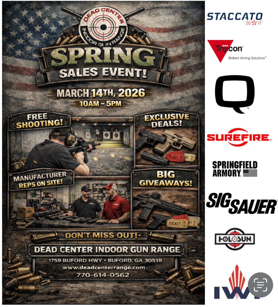 Please join us for our Spring Event coming up next month on March 14th from 10am-5pm at Dead Center Range! We invite you to come shoot some of our guns and our ammo for free to test out some new ones you may not have tried! We will have lots of giveaways and deals especially from the companies listed below that will be joining us for the event. Manufacturer reps will be joining us from these companies as well so bring all your questions for them! please call or email for more details!